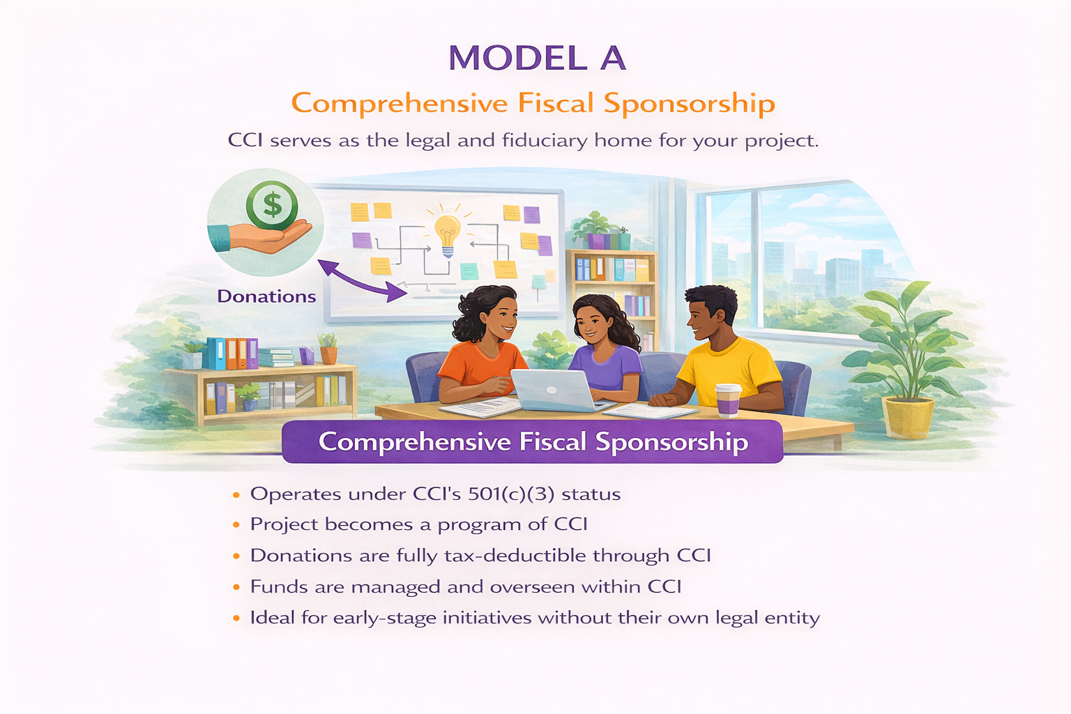 Model A is designed for initiatives that do not have their own nonprofit status and need a legal and financial home. Under this model, your project operates as part of CCI and raises funds through our 501(c)(3) structure. This approach is ideal for early-stage initiatives seeking full integration and oversight.